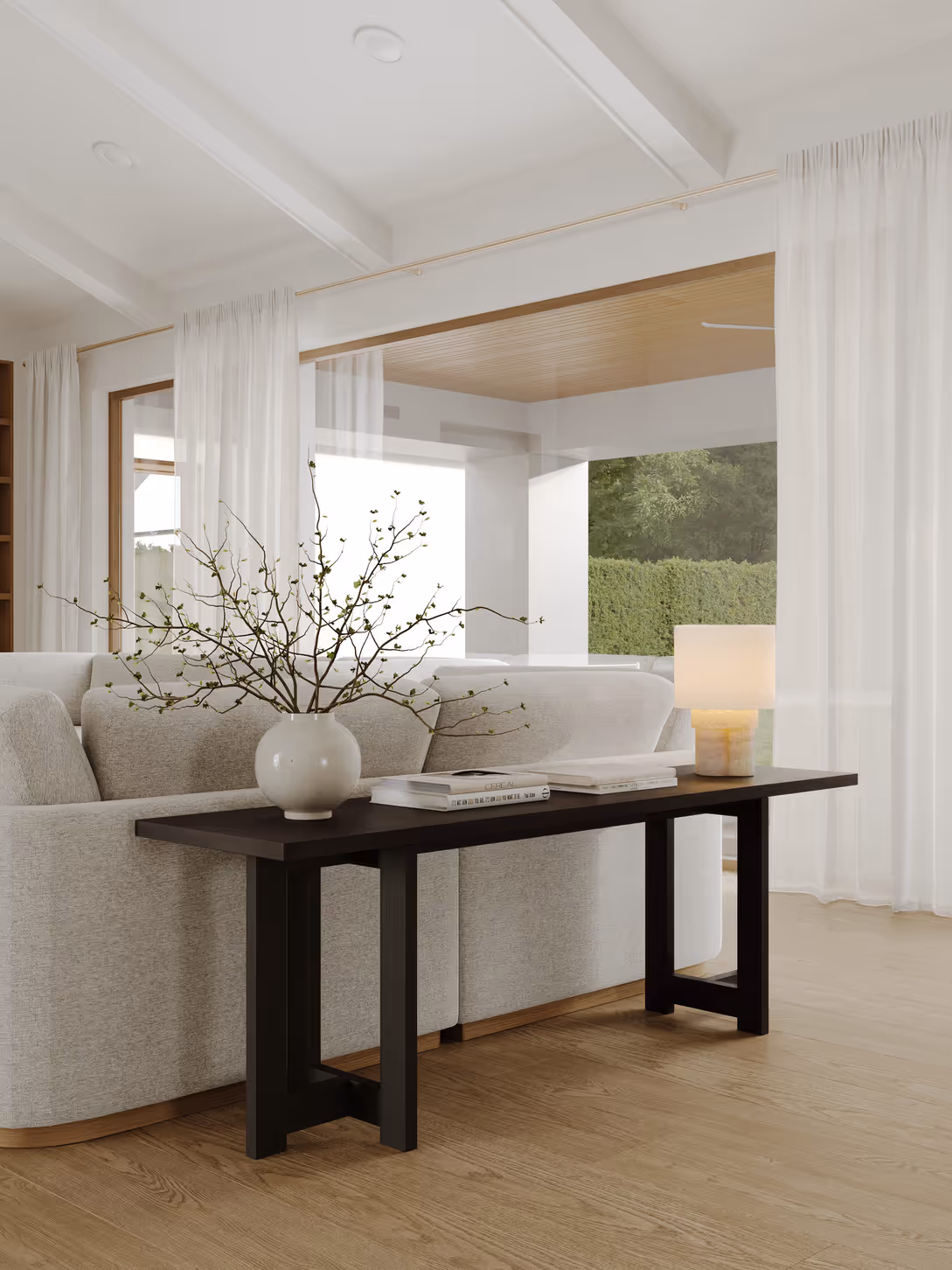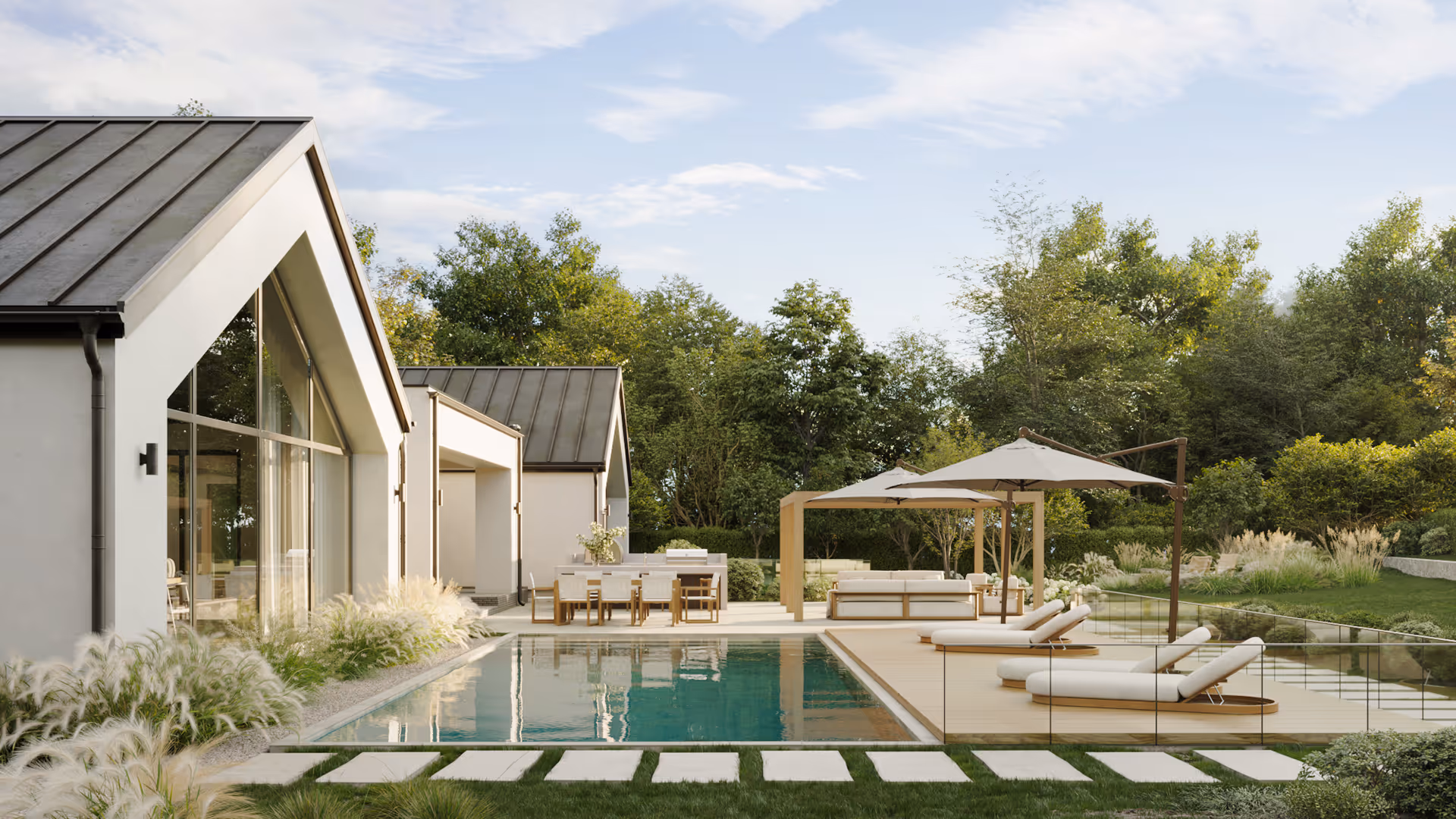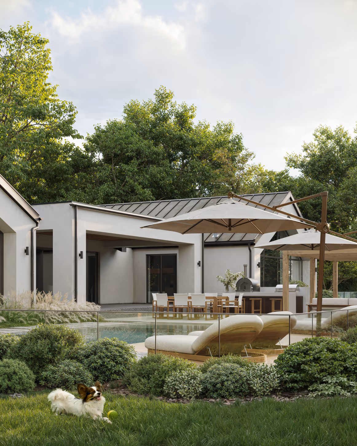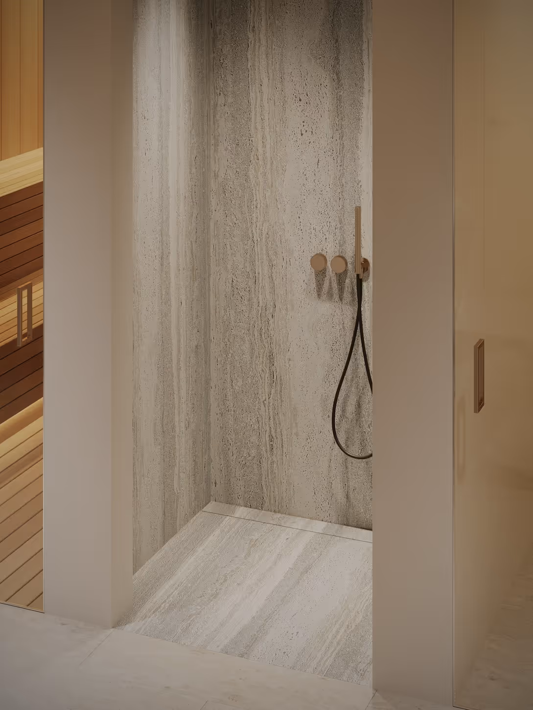 In New Jersey’s rolling plains, this residence explores the dialogue between modern American living and European design sensibility. The project began with strong architectural bones - connected A-frame structures with dark metal roofing - but required interiors that could match this contemporary presence while adding warmth and functionality. The basement renovation became an exercise in elevated living. Travertine and steam meet in a spa-like hammam, while a dedicated Pilates studio brings wellness home.