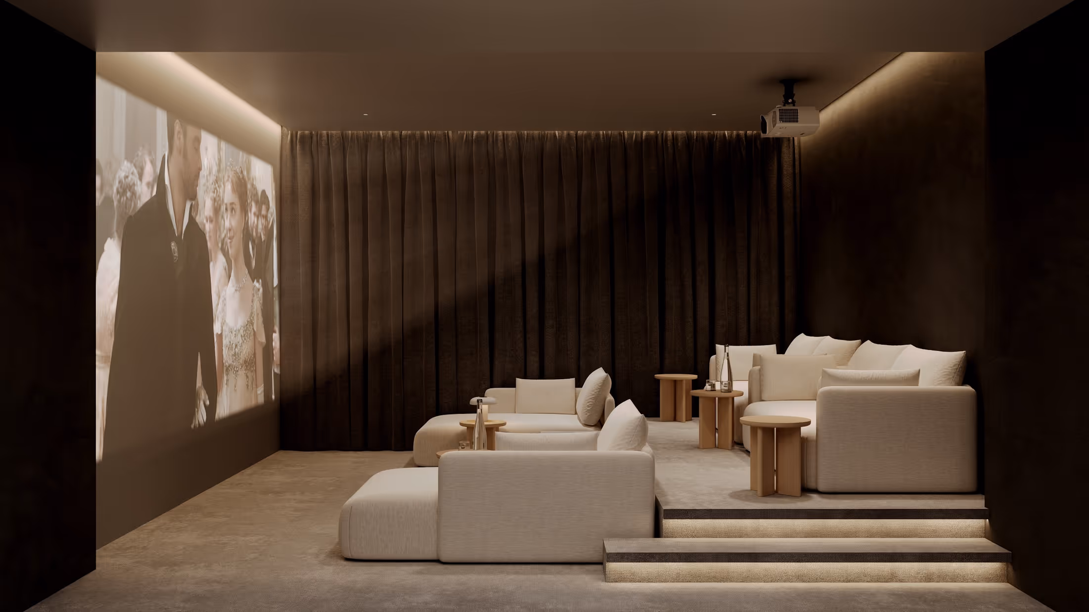 The movie theater and recreation lounge—complete with a pool table and kitchenette—create intentional spaces for gathering and entertainment. Rich velvet drapery and dark-toned finishes enhance acoustic performance while setting a cinematic atmosphere. Layered lighting and deep, lounge-style seating make the room immersive and inviting.