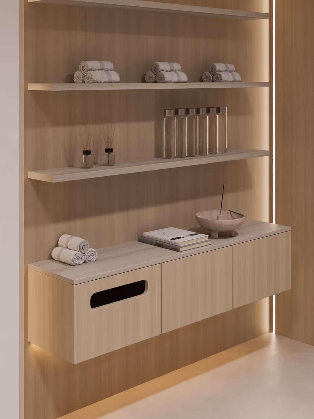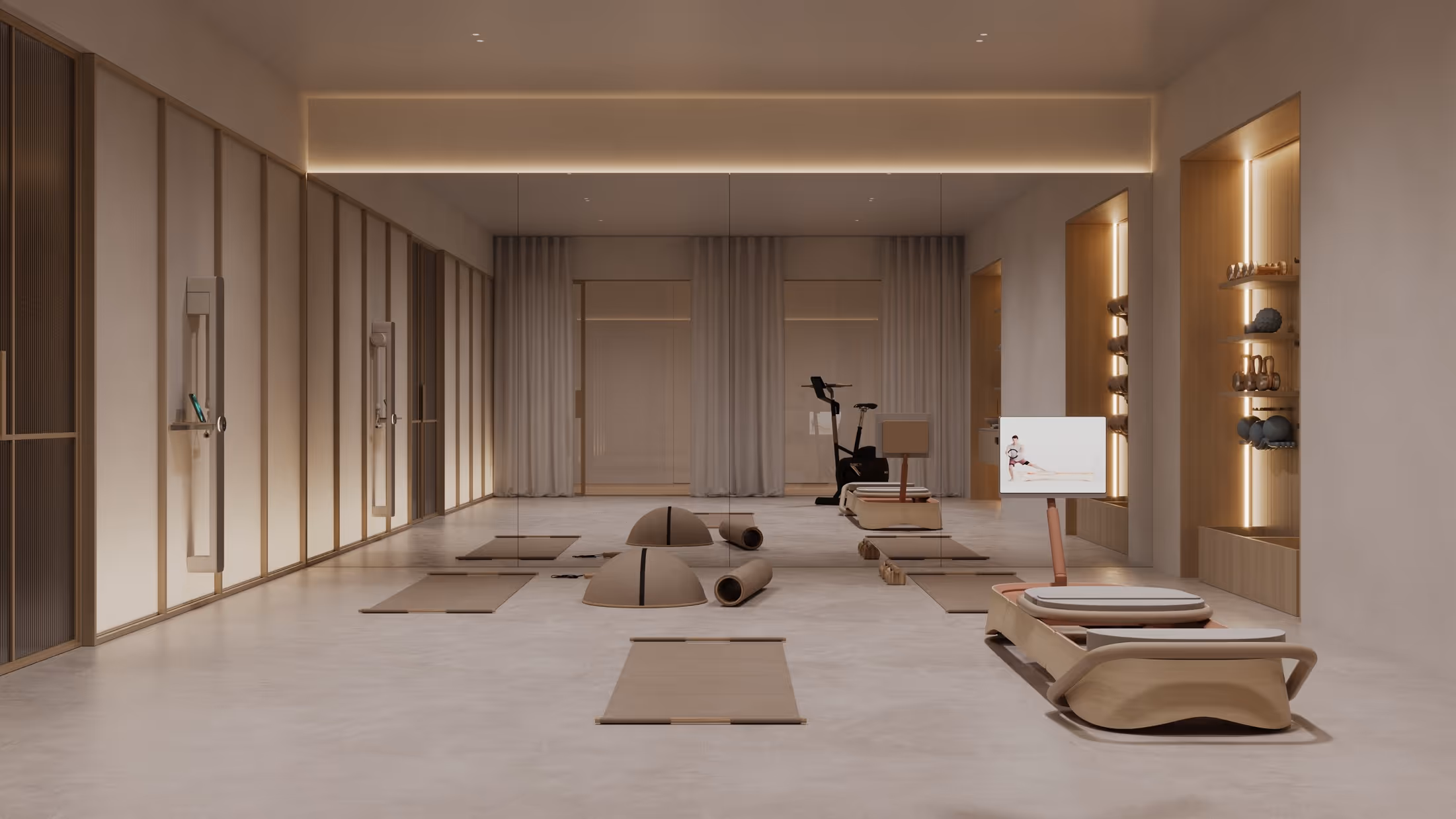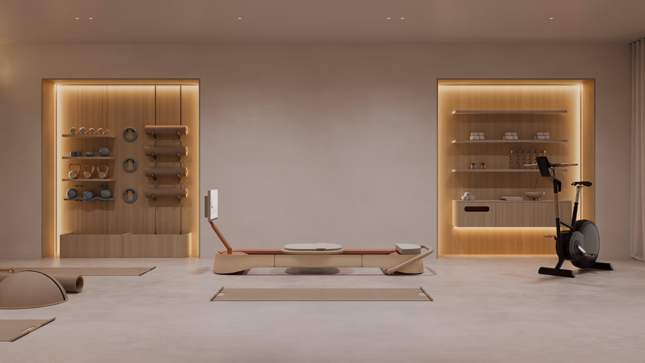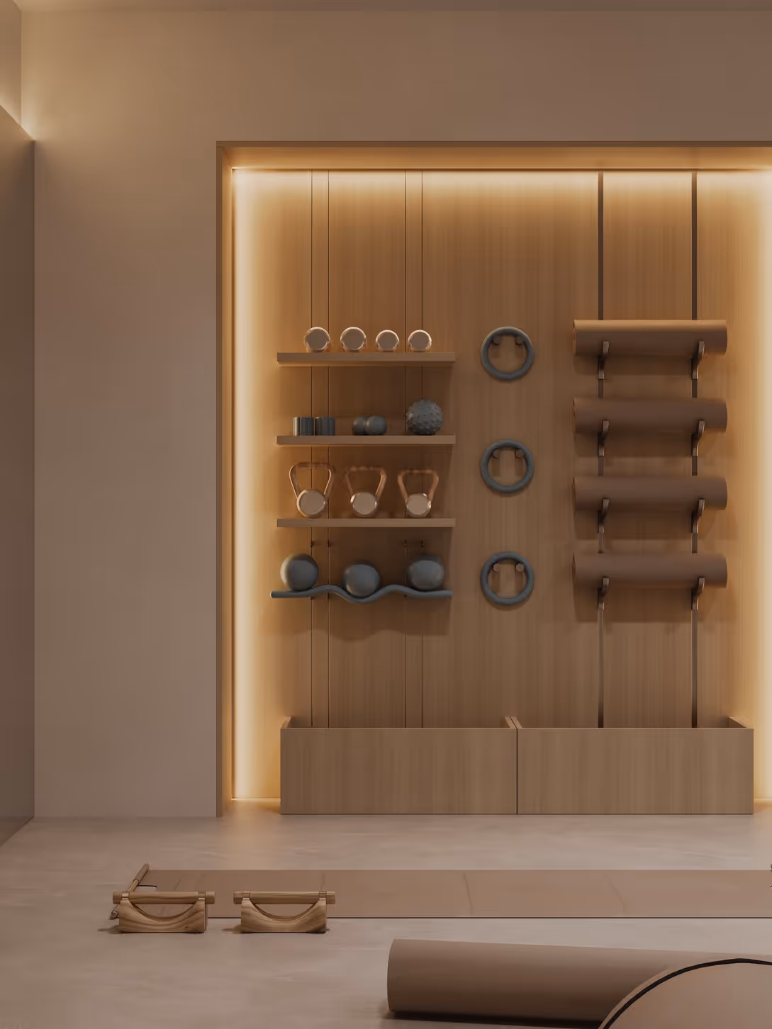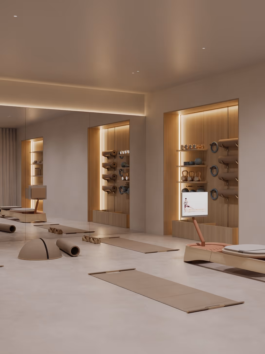 This Pilates studio was designed for a renowned celebrity Pilates instructor, combining state-of-the-art equipment with a warm, architectural atmosphere. Custom millwork niches, soft integrated lighting, and mirrored walls create a space that feels both luxurious and performance-driven. Neutral tones and tactile materials elevate the environment into a calm, focused training sanctuary.