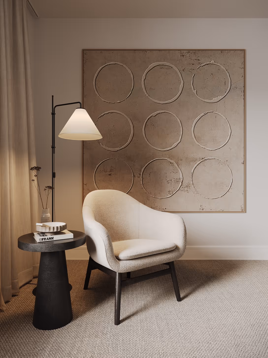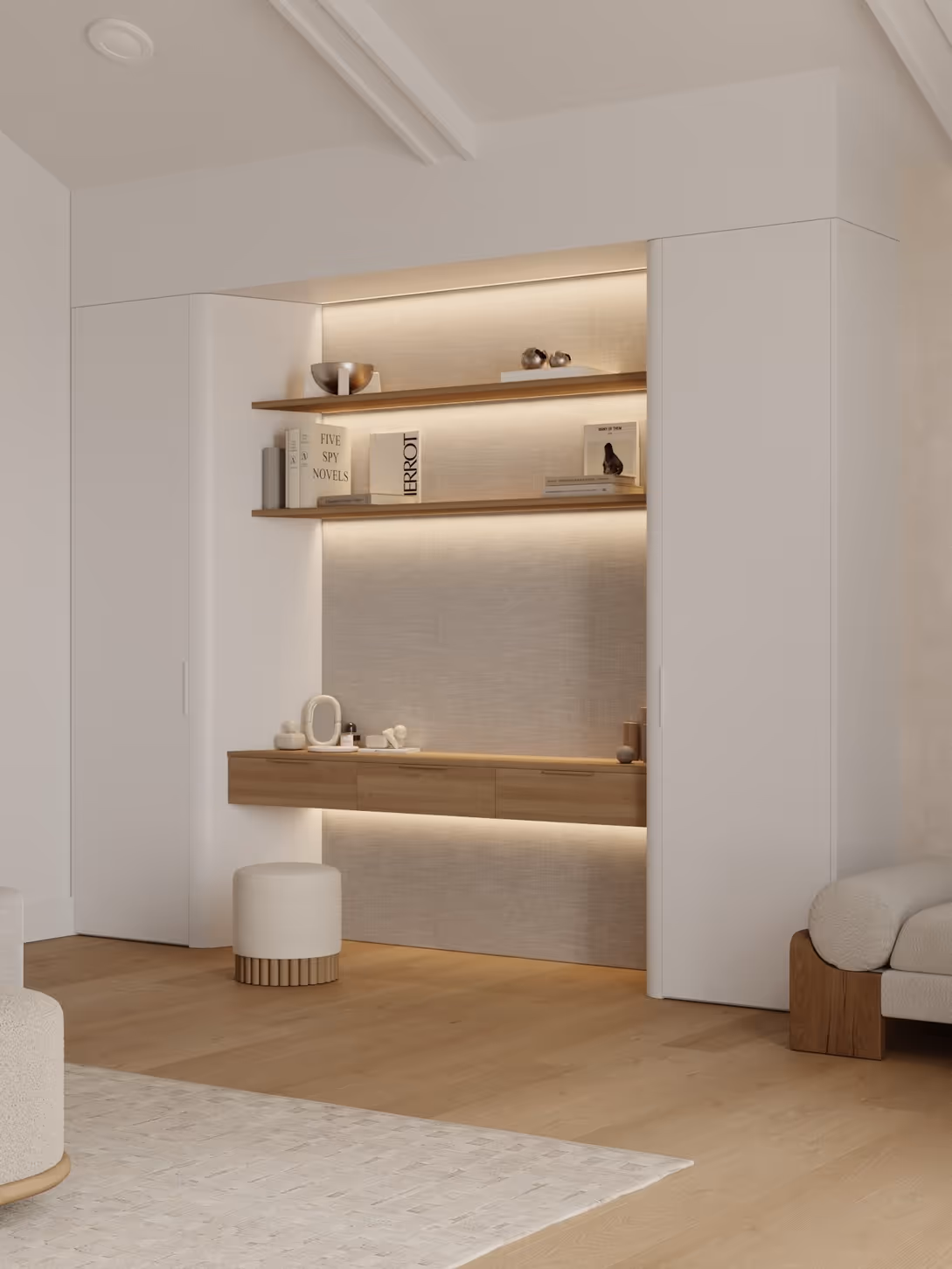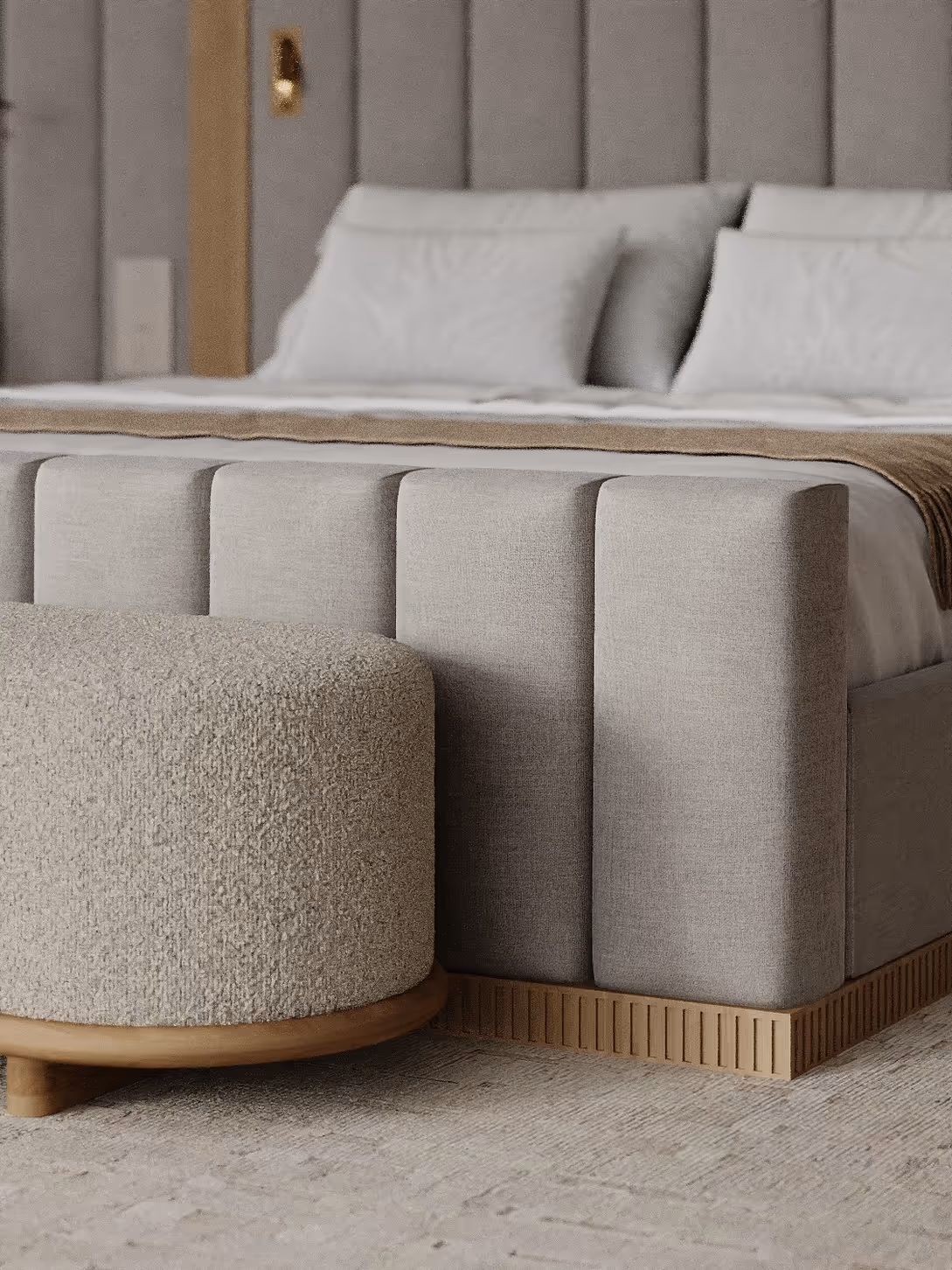 Curved upholstery, textured fabrics, and fluted wood elements bring depth and softness to the bedroom’s design language. The palette of natural tones is elevated by a floating vanity and illuminated shelving, adding structure without visual weight. The combination of warm materials and sculptural forms creates a serene, highly intentional environment.