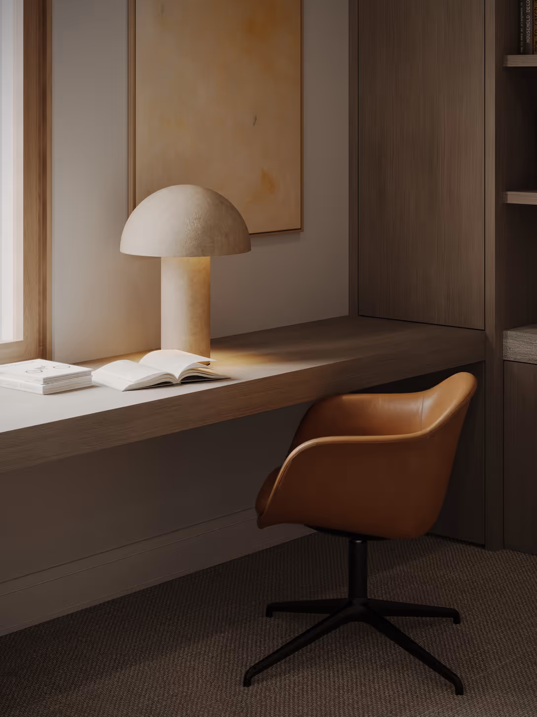A serene office defined by natural travertine, warm wood cabinetry, and soft, diffused lighting that enhances the texture of every surface. Integrated shelving and a sculptural desk bring both elegance and quiet functionality to the space.