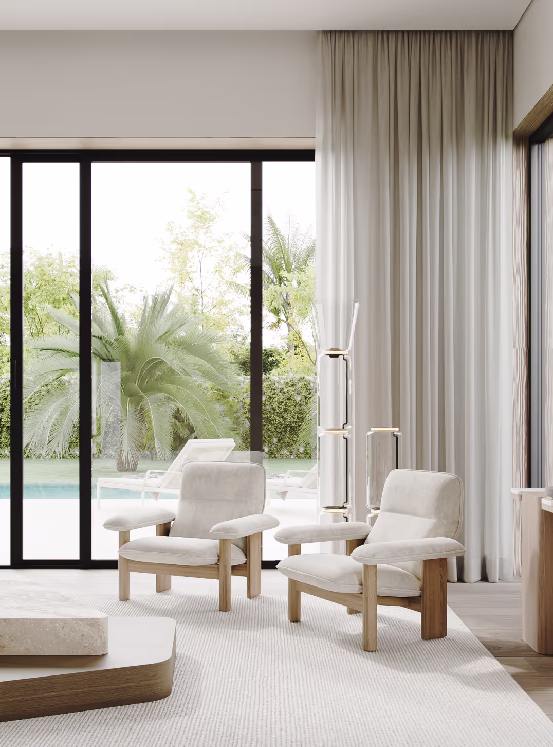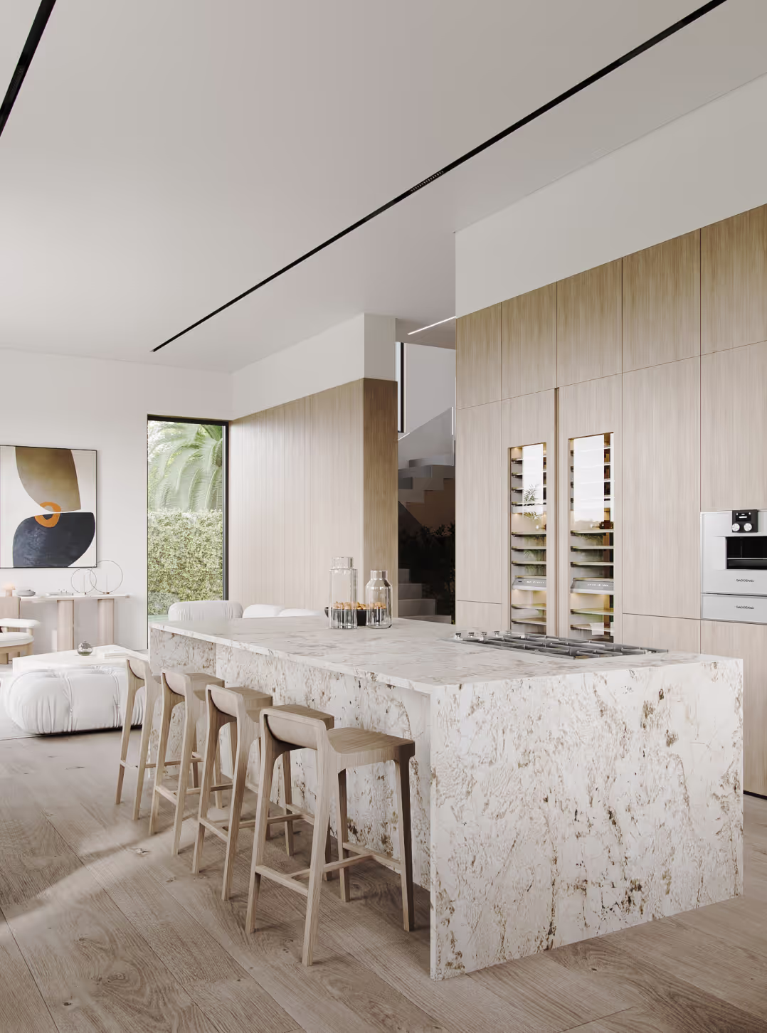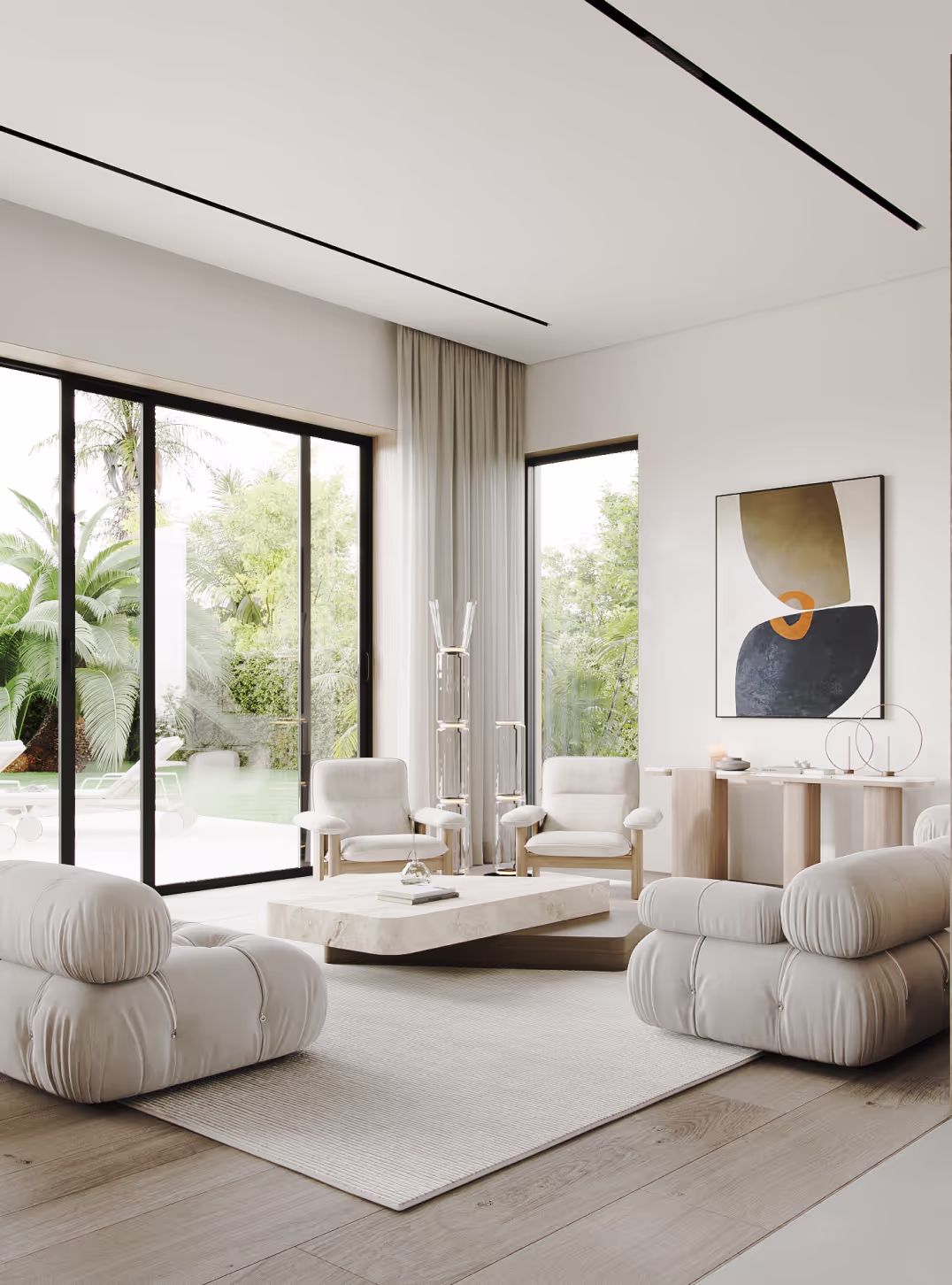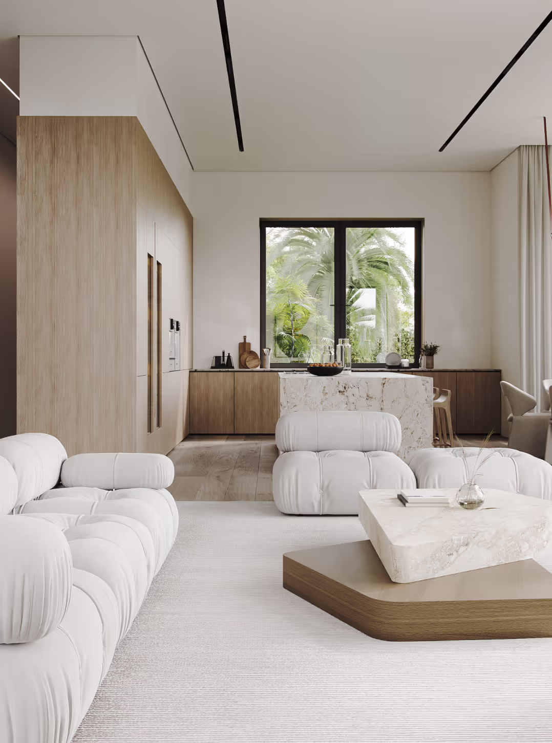 This living space is framed by floor-to-ceiling windows, allowing natural light to wash over our studio’s custom-mixed plaster walls and soft neutral palette. Sculptural seating pieces are paired with iconic Flos lighting, creating a balance of warmth and modern sophistication. The result is a serene lounge zone that celebrates light, texture, and indoor–outdoor connection.