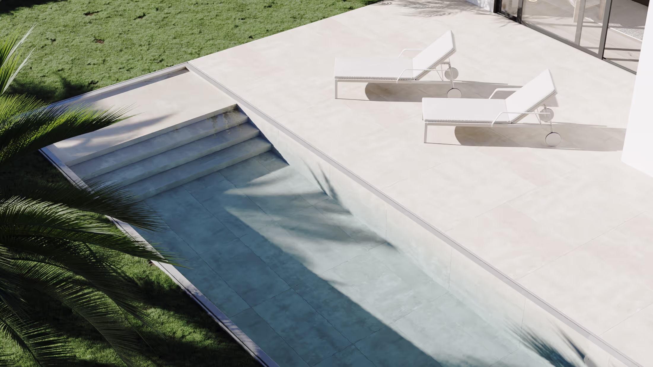 This staircase is designed as a sculptural architectural statement, featuring floating steel treads with impressive detailing and a frameless glass guardrail. The base is anchored by layered stone platforms in a striking hand-selected Breccia marble, creating a monumental foundation. Integrated landscape lighting softens the geometry and adds depth.