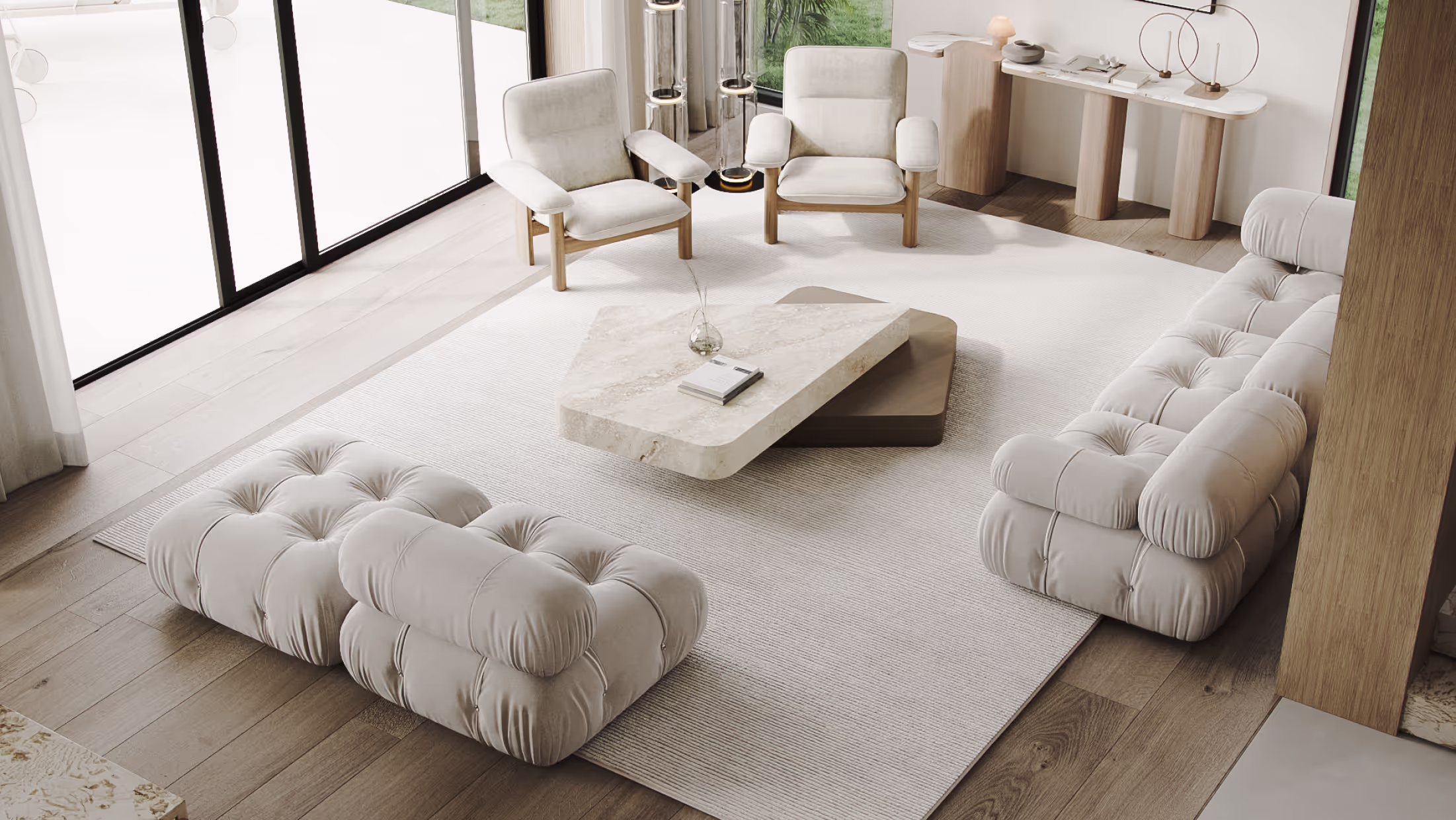 A sculptural tufted chaise sits before floor-to-ceiling windows, blending soft textures with natural light for a calm, elevated lounge moment.