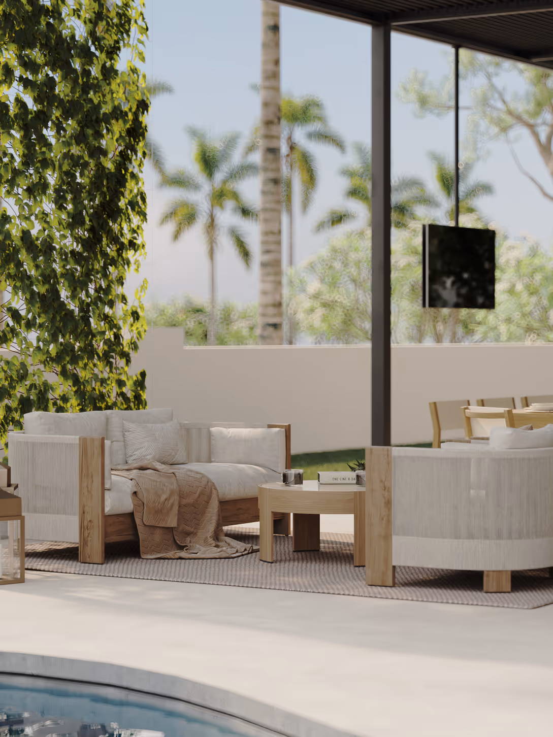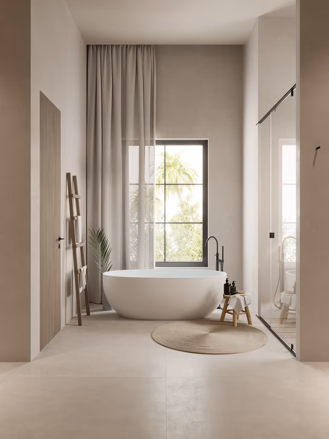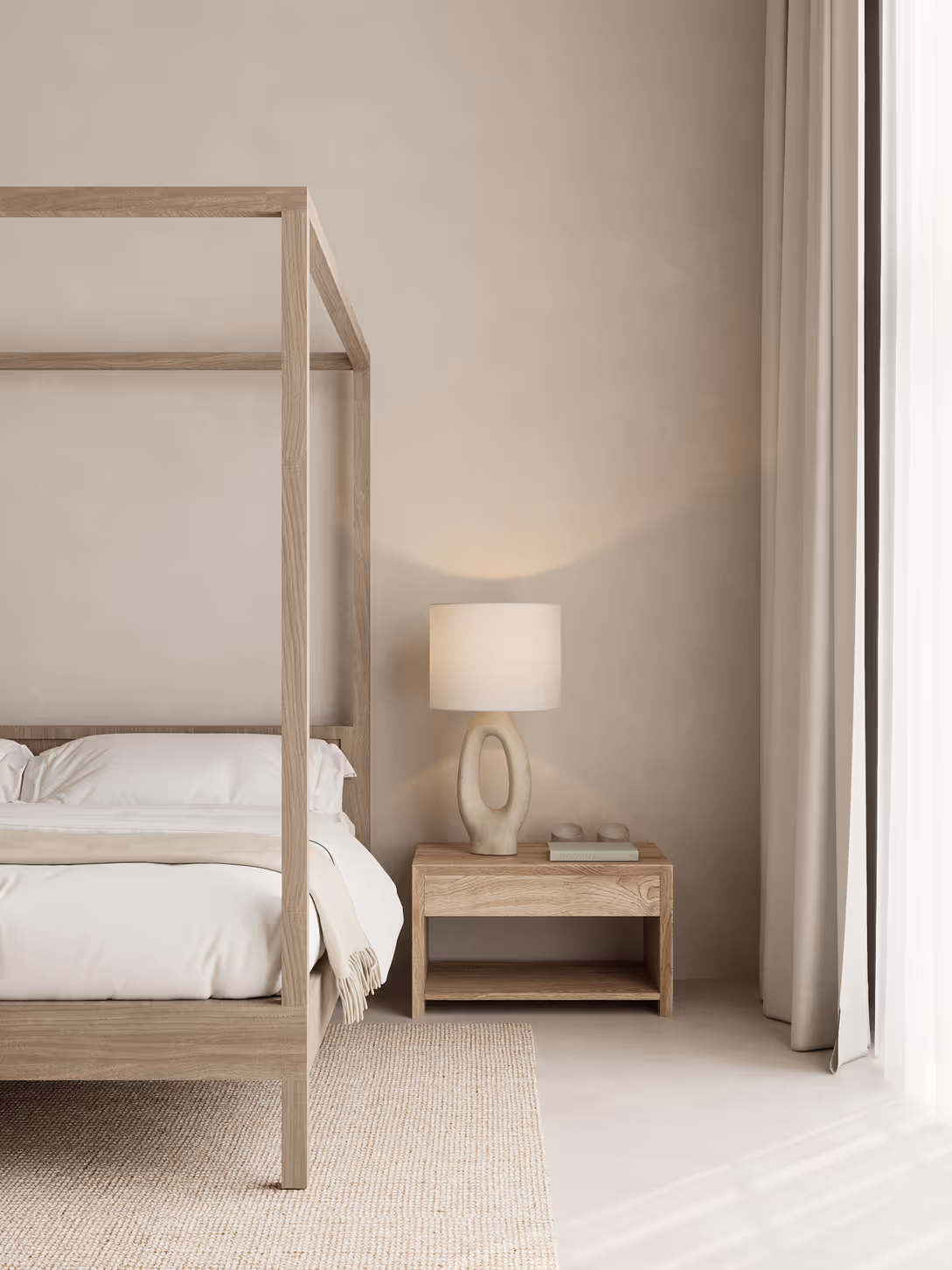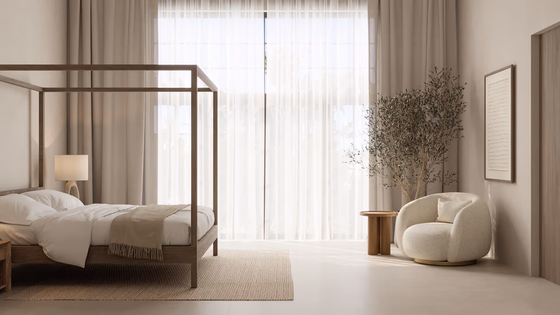 This bedroom is designed as a serene, light-filled retreat, anchored by a natural wood canopy bed and layered neutral textures. Soft plaster walls, warm timber tones, and tactile fabrics create an atmosphere of calm refinement. Sculptural furniture and diffused daylight complete a space that feels timeless and effortlessly restful.